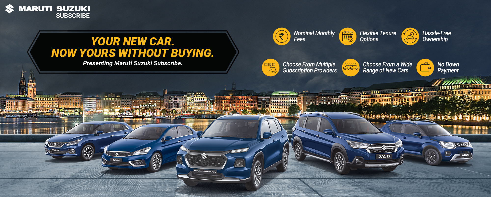 Maruti Suzuki Subscribe enables all customers to enjoy driving their preferred Maruti Suzuki cars without having to deal with all the financial responsibilities that come with owning a car.All you need to do is opt for a monthly subscription plan at a fixed monthly fee, which includes the routine maintenance and insurance costs, and choose a flexible tenure. At Kataria Automobile in, , Ahmedabad, all Hatchback, Sedan, SUV, the MUV models line-up includes Baleno, Invicto, EVitara, Jimny, Ciaz, Ignis, Fronx, Grand Vitara, XL6. Here, you will enjoy Maruti Suzuki Subscribe benefits such as: